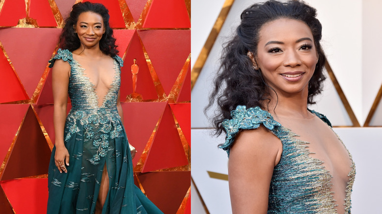 Actress Betty Gabriel stunned everyone when she stepped out on the red carpet wearing a gorgeous teal number. The gown, which featured a plunging naval-deep neckline and accents of gold, was designed by Tony Ward (via Just Jared). The floral embellishments around the shoulders, the waist, and the semi-sheer long train proved to be risks worth taking. Gabriel wore her long, curly hair down in a half-pulled back style and painted on a rose-gold lip, leading us to believe that she must be some kind of royalty.