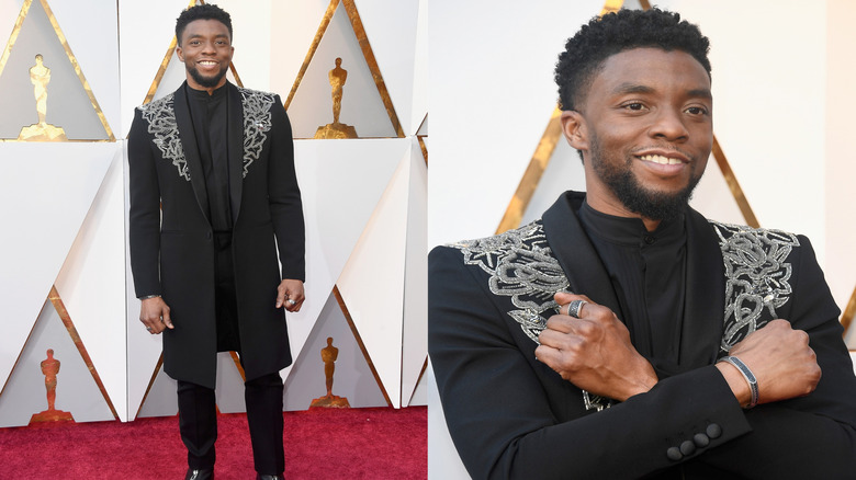 Though most of the men at the Oscars looked dapper, Black Panther star Chadwick Boseman stood out from the rest with his all-black ensemble, which featured a heavily embellished jacket. As Vogue described, Boseman rocked a Givenchy topcoat with what appeared to be silver embroidery. The luxe look may have been deliberately chosen with Boseman's Marvel character — T'Challa, King of Wakanda — in mind. Need more proof of purpose than Boseman's royal-looking suit? Well, while on the red carpet before the awards show, Boseman posed with his arms crossed over his chest — a move known as a kind of salutation in the Black Panther movie. Plus, Boseman also shouted out, "Wakanda forever," during a pre-show interview. So... there.