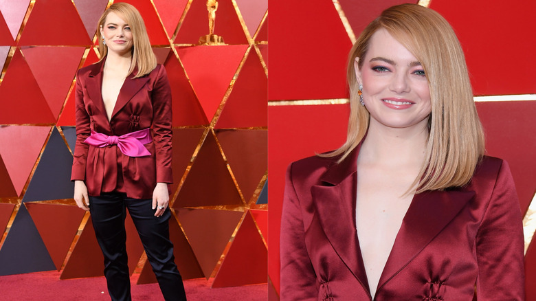 As reported by Entertainment Weekly, Stone donned a Louis Vuitton pantsuit, consisting of black pants and a silky red blazer tied together with a pink belt. The color combo, while unexpected, is a fun choice for the otherwise stiff Oscars affair. However, some fans felt that the suit was just a bit too casual for the high-class event.