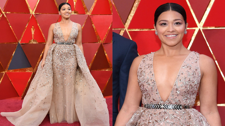 Jane the Virgin star Gina Rodriguez proved that she could rub elbows with the best of them at the Academy Awards, as she walked the red carpet in a beautiful Zuhair Murad gown (via The Hollywood Reporter). The champagne-colored dress boasted a deep-V neckline, a sheer skirt, and a cinched waist. Rodriguez, who made the transition to blockbuster films with the 2018 movie Annihilation alongside Natalie Portman and Tessa Thompson, kept the gown from feeling too princess-y with a middle part and a sleek low ponytail. She also wore minimal accessories, donning only a pair of earrings and ... an engagement ring?