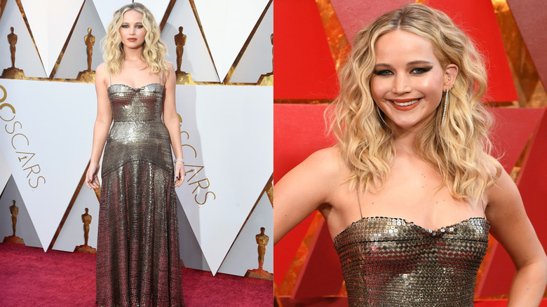 The Red Sparrow star arrived at the 2018 Oscars in a shiny Dior column dress. The incredibly detailed metallic number hugged Jennifer Lawrence around the bodice and waist before tapering off at the hips. The floor-length stunner was held up by two skinny spaghetti straps and feature a sweetheart neckline. As noted by Vogue, Lawrence's Maria Grazia Chiuri-designed dress appeared to draw inspiration from chainmail, which made the feminist actress' choice seem like the glam wardrobe of a warrior woman heading into battle, driven to smash the glass ceiling — and the whole dang patriarchy. And, given the climate in Hollywood at the time, Lawrence's fashion choice made perfect sense.