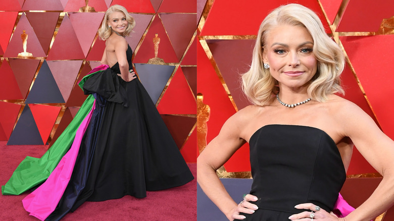 The morning talk show host served up a new look at the 90th Academy Awards. She wore a black strapless Christian Siriano ball gown — from the designer's Spring 2018 collection (via PopSugar UK) — and she looked amazing. But what initially seemed like the perfect wardrobe choice for Kelly Ripa quickly went south when the pint-sized star turned around. Hidden behind Ripa was a bright punch of color. Tied up in a backside bow detail and falling in a train behind her, pink, green, and blue fabric poured from the otherwise stunning dress, reminding us of the Powerpuff Girls which we doubt was Ripa's intention.