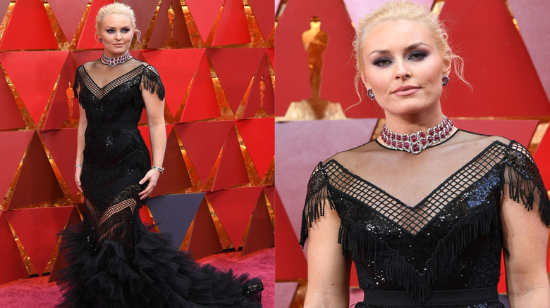 Olympic medalist Lindsey Vonn stepped out on the red carpet in a black gown, but the neutral-colored dress was anything but a safe choice. The dress featured clashing details, including mesh, fringe, and lots and lots of tulle. Vonn, unfortunately, only made matters worse with a tight updo, dark eye makeup, and a thick diamond choker. We get that Vonn was likely aiming for an enchanting Hollywood look, but her award show attire instead appeared more goth than glam.