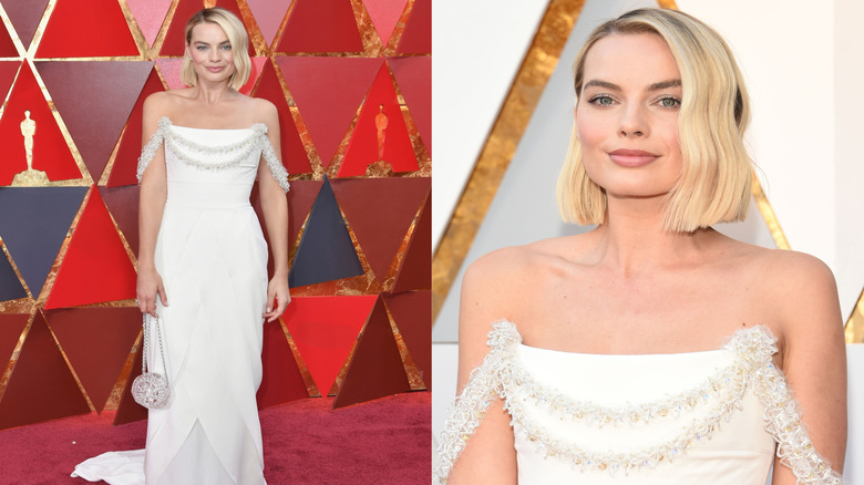 Australian beauty Margot Robbie was one of several Academy Awards attendees who wore white to the big event. And while Jane Fonda, Timothée Chalamet, and Janet Mock all looked amazing, Robbie really wowed with her white hot Chanel gown (via the Daily Mail). The dress featured off-the-shoulder straps with beaded embellishments, a subtle pleated skirt, and a train. Robbie complimented the look with a clear, gem-like evening bag and a pair of sparkly earrings. The actress, who was nominated for her film I, Tonya, kept her makeup rather natural looking and finished off the entire look with a short bob.