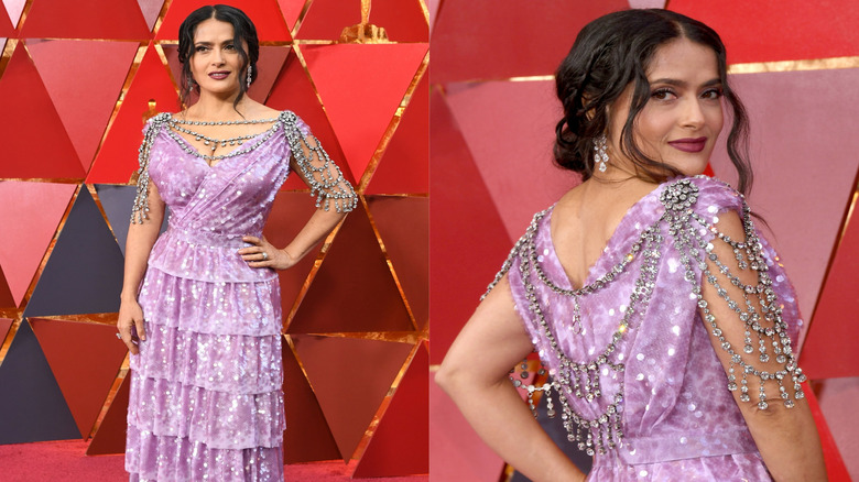 Let's get one thing straight before we go any further: Salma Hayek is absolutely stunning. She could wear nearly anything and still look amazing. That said, her 2018 Oscars look was less than stellar. To the biggest night in film, Hayek wore a custom Gucci gown and Harry Winston jewelry, as reported by Just Jared. And while the purple color of the dress complimented Hayek's complexion and dark hair, the other details of the outfit did nothing for her.