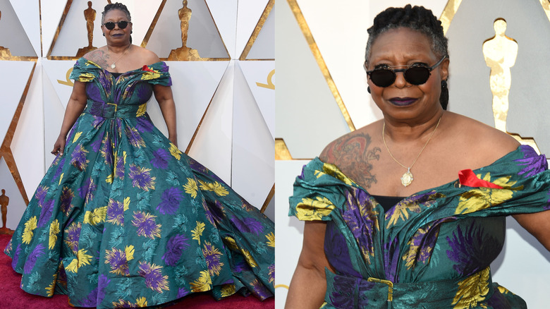It's not every day that you see The View co-host and bonafide movie star Whoopi Goldberg in a dress. It's just simply not her style. But the impossible happened at the 2018 Oscars when Goldberg walked the red carpet in an off-the-shoulder gown with a long, full skirt. While we can appreciate the bold green, purple, and yellow colors on the actress, the rest of the look didn't do all that much for her — and it definitely didn't keep her off of our worst dressed list.
