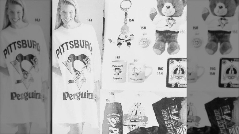 In the picture, a younger Beth smiles wide as she wears an oversized Pittsburgh Penguins shirt. Beside her are products like mugs, license plate covers, and a teddy bear wearing its own Pittsburgh Penguins shirt.