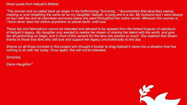 She continued, "These lies and fabrications cannot be tolerated and allowed to be spewed from the forked tongues of saboteurs of Aaliyah's legacy. My daughter only wanted to realize her dream of sharing her talent with the world, and give her all performing on stage, and in front of the camera for the fans she adored so much." She added, "She realized that dream thanks to those true fans who still love and support her legacy unconditionally to this day."