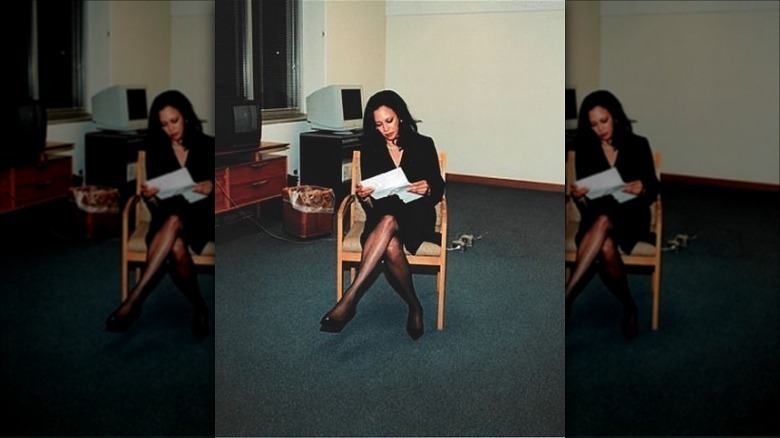 Another time Kamala Harris ditched her typical pantsuit was in 2008 at the red carpet premiere of "Milk" in Los Angeles. Similar to her throwback snap, she paired a structured blazer with a black top and pencil skirt that allowed the press and onlookers to get an eyeful of her toned legs. Harris, then the district attorney of San Francisco, completed the look with a pearl necklace, a black clutch, and sheer stockings. She kept her makeup minimal while her hair was styled in soft, loose waves.
