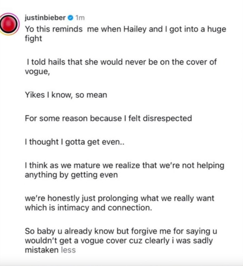 It's truly baffling the kinds of things celebrities openly admit to doing when literally no one asked. Hailey Bieber recently graced the cover of Vogue, and husband Justin Bieber decided to fall on his sword and admit he messed up — while also making his wife's achievements about him. The "Sorry" singer posted the cover to Instagram and has since edited his caption to just a string of emojis. But, screenshots are forever, and his original caption was much more cringey.