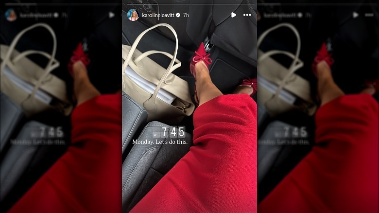 Ahead of the sit-down, Leavitt took to her Instagram Story to snap a pic of her look before pulling up to the White House. While the dress itself was okay, her choice of footwear was questionable, as she went with flashy red bow heels instead of her usual black or nude pumps (seen below). She accessorized with a designer bag and her signature cross necklace. Once again, she ruined her outfit with one glaring mistake.