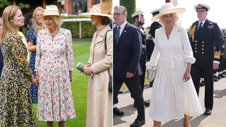 To give you just one example, Camilla graced the annual Ebor racehorse festival in York, England in August 2025 sporting a bright, floral-print dress with long sleeves and a modest hemline. She accessorized her outfit with a pale blue coat and a white hat, along with a pearl necklace, a small woven handbag, and a pair of tired-looking shoes. She wore a different version of the same frock at a celebration honoring war veterans in London just a few days prior. Photos, such as the one on the right, show Camilla wearing a white dress with a similar cut and hemline.