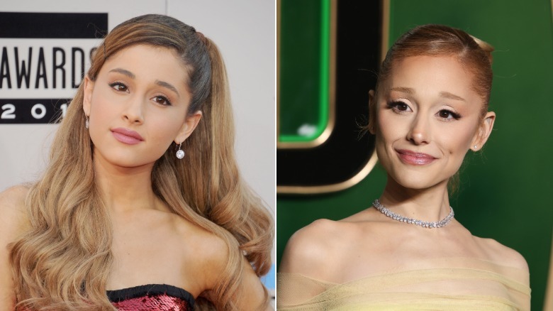 Ariana Grande's journey to megastardom has seen her transform from a teen actor into a multi-hyphenate pop icon whose look has evolved alongside every new era of her music. While a lot of that comes down to switching up her hairstyle and fashion choices (from ponytails and oversized sweaters to dyeing her hair platinum blonde for "Wicked"), you can't help but notice her face has changed a lot, too. In fact, side-by-side photos of Grande over the years show just how dramatic and jarring her glow-up has been. Who could tell these two are the same person?
