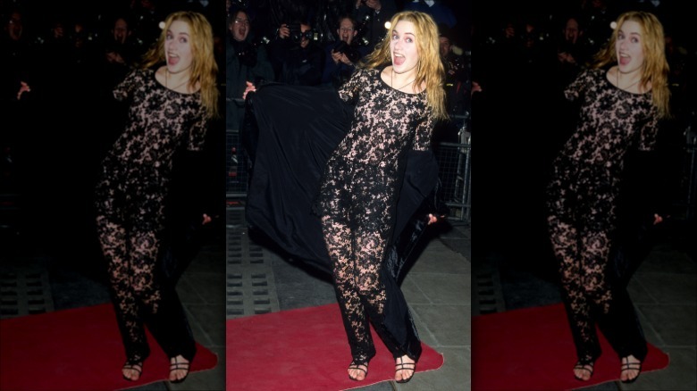 How that was done, she wasn't entirely sure, but at least she made some progress in her protocol knowledge since she first met the now-king in February 1996. When Charles, then Prince of Wales, attended the royal premiere of "Sense and Sensibility," he encountered a much less prepared Winslet. Even though she knew she would be meeting Queen Elizabeth II's son, Winslet still chose to rock a completely sheer jumpsuit to the occasion, as seen below in all its glory.