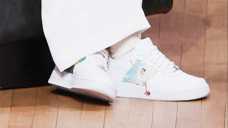 At the talk she hosted with White House Press Secretary Karoline Leavitt on April 2, Erika showed up in a relaxed off-white three-piece pantsuit, with a button-up vest peeking out from beneath her blazer. But when it came to the shoes, she definitely could have picked a better pair. Erika completed her ensemble with white sneakers with a small platform sole. The shoes featured various artwork on the sides, with an American flag, a cross, and what appeared to be a painting of Charlie holding a MAGA hat among the images included. While the imagery was on-theme with Turning Point USA's ideals, sneakers were probably not the move for a serious talk.