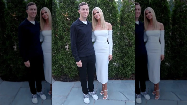 Take, for instance, when the couple attended a UFC fight in June 2025. Ivanka wore a white off-shoulder pencil dress (which, TBH, was arguably too formal), while Jared wore a black long-sleeve golfer and pants, a white undershirt, and white sneakers. It looked like they were headed to different places, and in one of the pics from Ivanka's Instagram photo dump, her hubby seemed to realize it. Cue a spectacularly awkward pose while she gave full-on glamazon.
