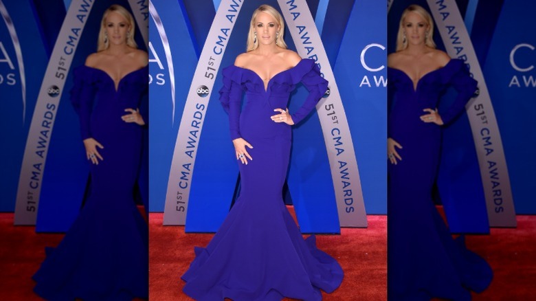 As the co-host of the CMA Awards for the 10th time, Carrie Underwood had a lot pressure on her to choose a show-stopping ensemble. And boy, did she deliver! The "Before He Cheats" singer donned an off-the-shoulder cobalt blue Fouad Sarkis gown (via PopSugar.) While ruffled sleeves would certainly be way over-the-top for any other occasion, the embellishment proved to be just right for Underwood's glam CMA appearance. She finished off her look with some silver bling.