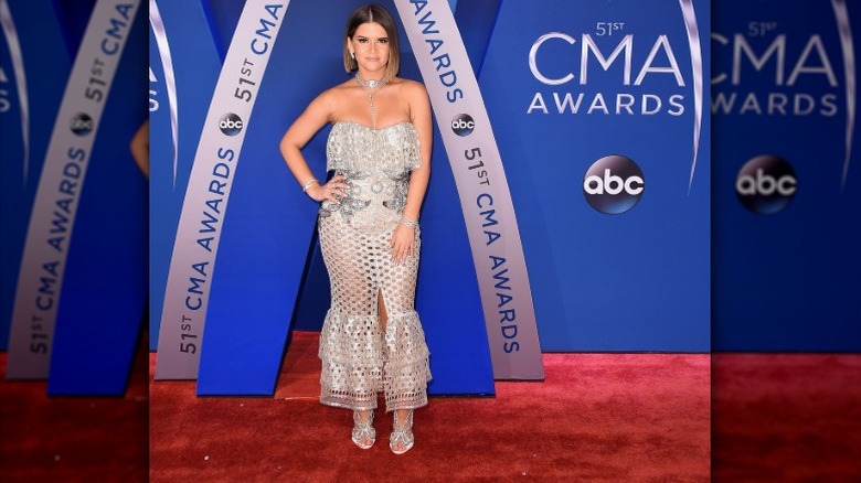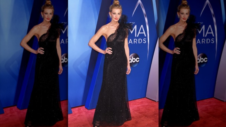 Though not a country music star, model Karlie Kloss walked the CMA red carpet and, unsurprisingly, outdid most of the night's honorees with her tangerine dress. Kloss, who ran the annual New York City Marathon just days earlier, showed off her tanned and toned body in the Elie Saab gown, which featured numerous see-through panels (via Daily Mail.) She further added to the get-up with a pair of open-toed sandals and several gold bangles on each wrist. Needless to say, she looked effortlessly chic, even hours later as she announced her BFF Taylor Swift as the winner of song of the year.