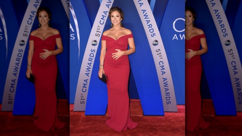 While some women might try to hide their growing baby bump, Jessie James Decker chose to show hers off to the world in a red hot body-hugging gown. As the Daily Mail notes, the country singer-turned-reality TV star wore a cranberry Nookie Dolly dress. Like many other CMA attendees, Decker kept her accessories simple, wearing silver teardrop earrings and several glitzy bangle-style bracelets on her right wrist. Hair pulled back in a loose ponytail, Decker allowed her pregnant belly to take center stage, demonstrating that women can be drop dead gorgeous no matter what trimester they're in.