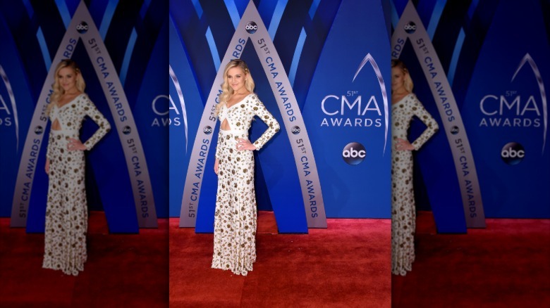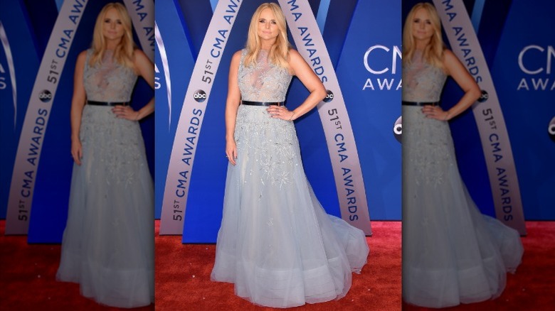Did the "Tin Man" songstress travel to the CMA Awards in a pumpkin carriage? Miranda Lambert rendered fans speechless with her gorgeous pale blue gown that looked straight out of a fairy tale. The tulle dress designed by Tony Ward featured intricate silver beading across its bodice, resembling small stars or snowflakes (via People.) Lambert expertly kept her hair and makeup simple, opting for slightly waved tresses and a light pink lip. She added a thin belt to show off her slim waist and donned minimal jewelry, keeping all the focus on her show-stopping look.